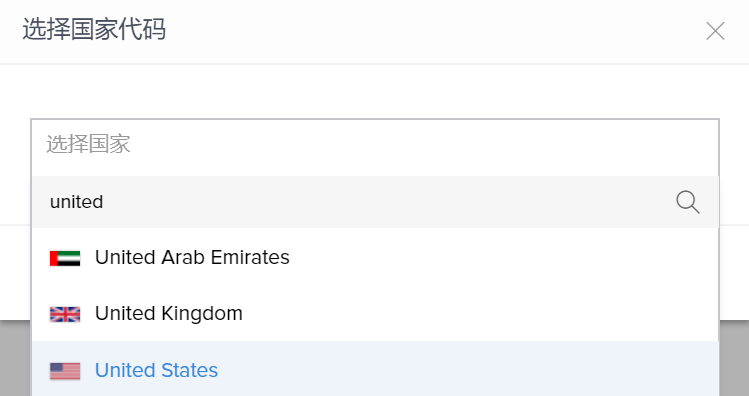 或者,可在字段中输入相应内容以搜索所需国家/地区。如下所示,输入“united”将列示包含该短语的国家/地区。通过此方式,您可更轻松地选择所需国家/地区。