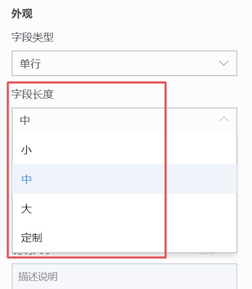 点击字段大小旁边的下拉列表并选择所需值。您可在小、中、大和自定义之间进行选择,如下所示。默认情况下将选择中。
