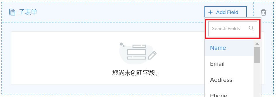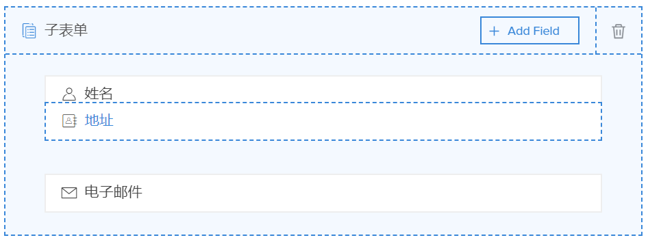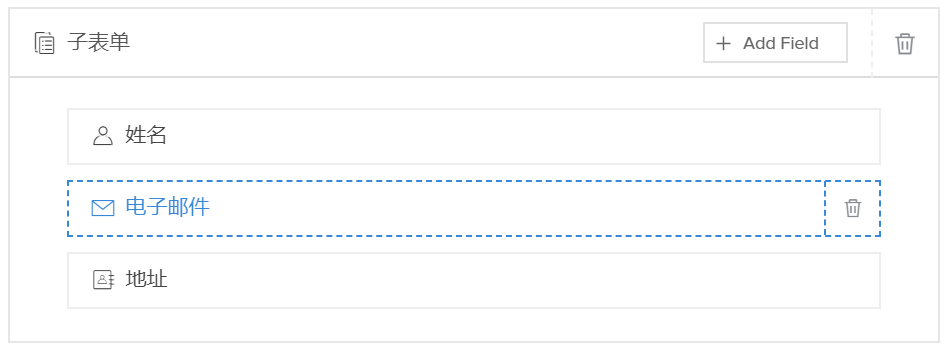 可在空白子表单中添加以下类型的字段:除公式、富文本、自动编号、用户、签名、添加注释和子表单字段以外的所有字段。