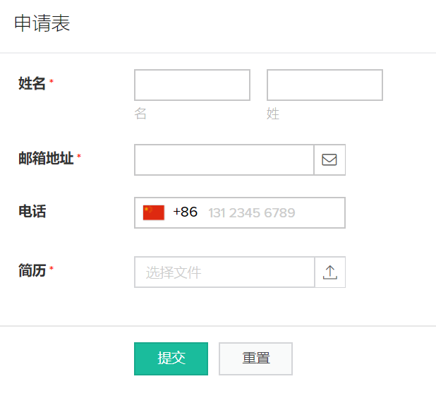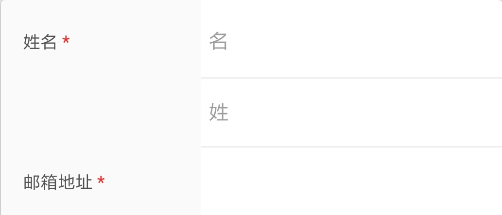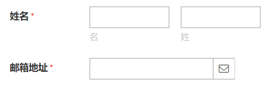 以下图像显示两种类型的字段:姓名(标签为姓名)和邮箱(标签为邮箱地址)。姓名字段的输入区域包含对应称谓的一个下拉列表,以及对应名字和姓氏的输入框。邮箱地址的输入区域包含一个输入框。