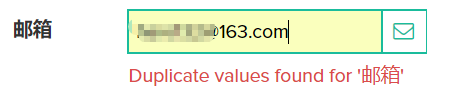 例如,当您为表单中的邮箱字段启用无重复值属性时,如果用户输入重复的邮箱地址(现有记录中已存在该地址)并从 Web 浏览器提交表单时,会发生下面的情况: