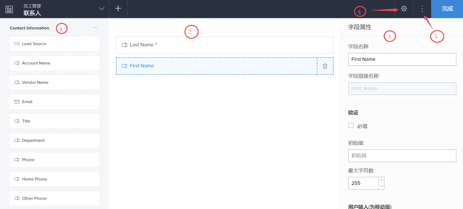 表单构建器是用于在 Zoho Creator 中构建和修改表单的界面。下图显示输入线索数据表单的表单构建器,此表单用于 Zoho CRM 中的“线索”模块。