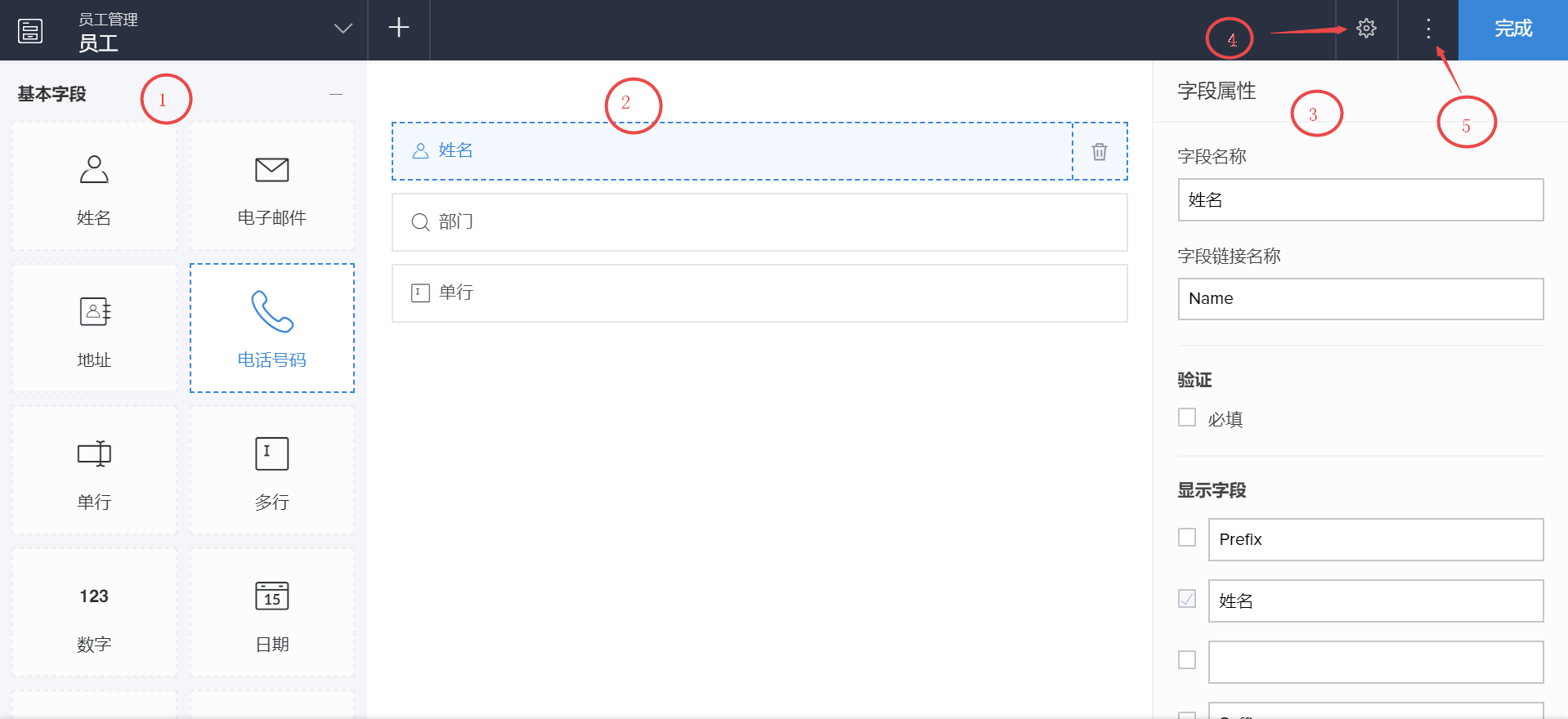 表单构建器是用于在 Zoho Creator 中构建和修改表单的界面。下图显示员工表单的表单构建器: