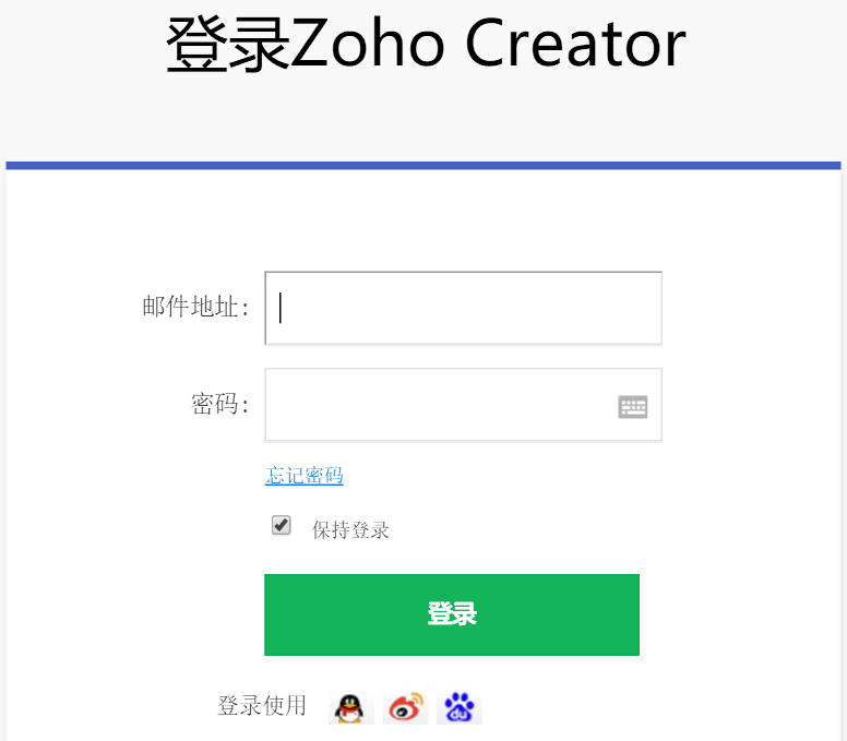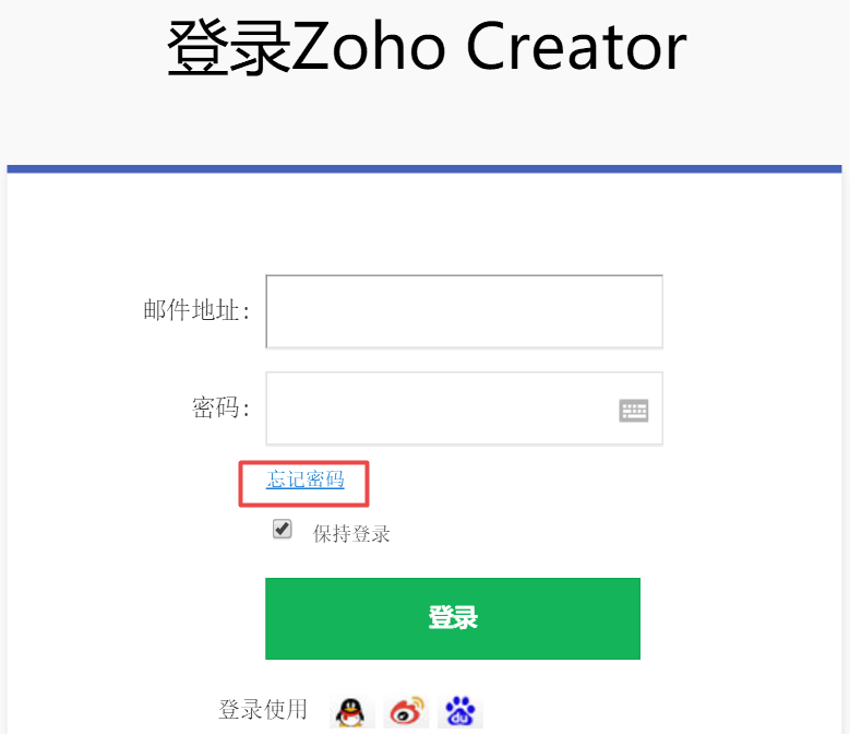 - 或者,您也可以使用您的 qq/微信/微博/百度 凭证访问 Zoho Creator。请参阅Zoho 单点登录帮助页面以了解有关联合登录的更多信息。