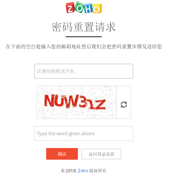 输入链接到您的 Zoho Creator 账户的邮件地址或手机号码。输入表单中显示的验证图像文本,然后点击确认。