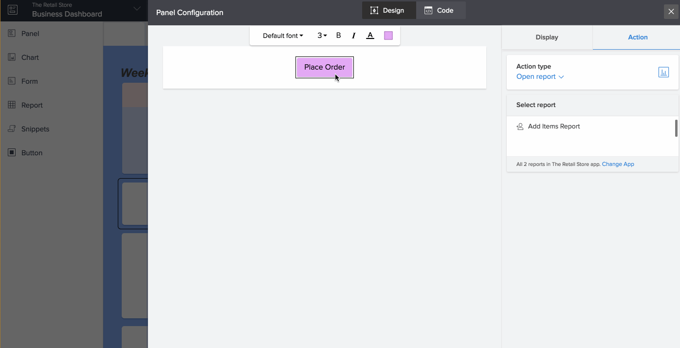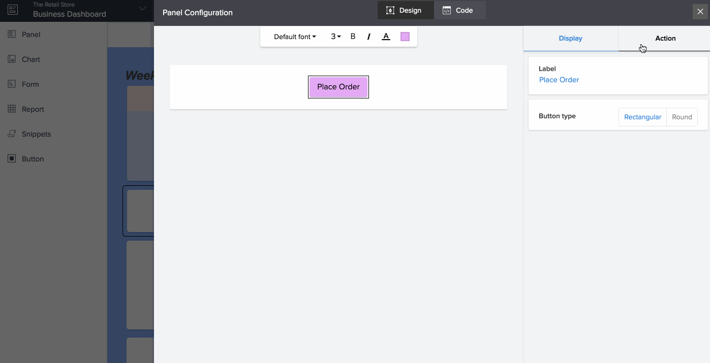您可以定义在点击面板中的图像时发生的操作。您可以将各种操作链接到图像点击动作,包括将用户重定向至外部 URL、打开 Zoho Creator 组件(例如,表单、报表或页面)。您也可以指定在点击图像时触发的自定义函数。