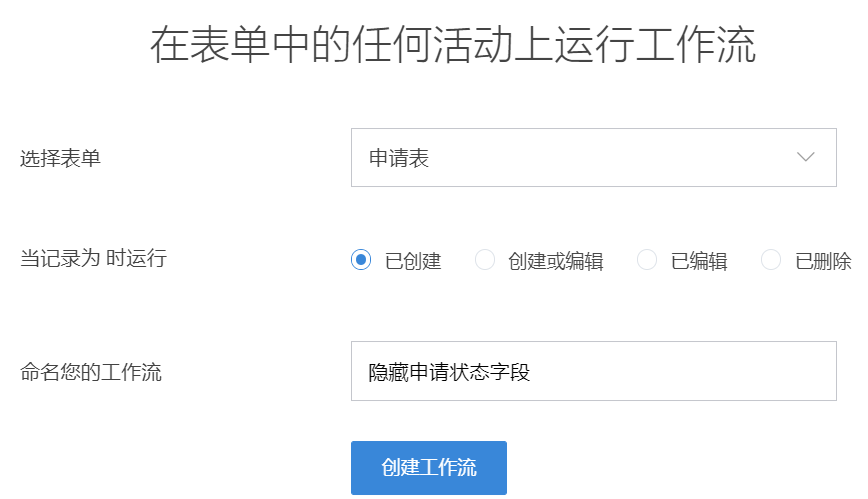 - 将工作流名称设置为‘隐藏申请状态字段’。