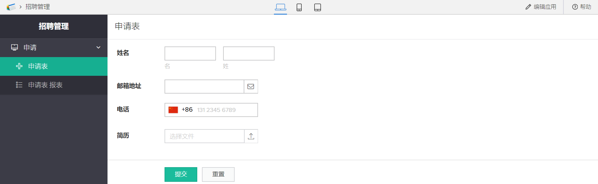 尝试通过表单提交一些虚构的求职者记录。这样做可帮助您在应用中继续添加组件(表单、报表、工作流和页面)时使您的应用更加形象化。