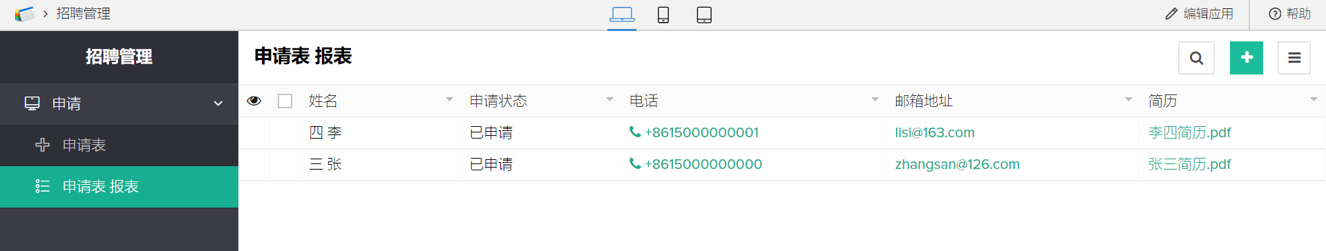 点击左侧的所有申请,如下所示。此时将显示一个列表报表。它将显示通过申请表提交的所有条目。
