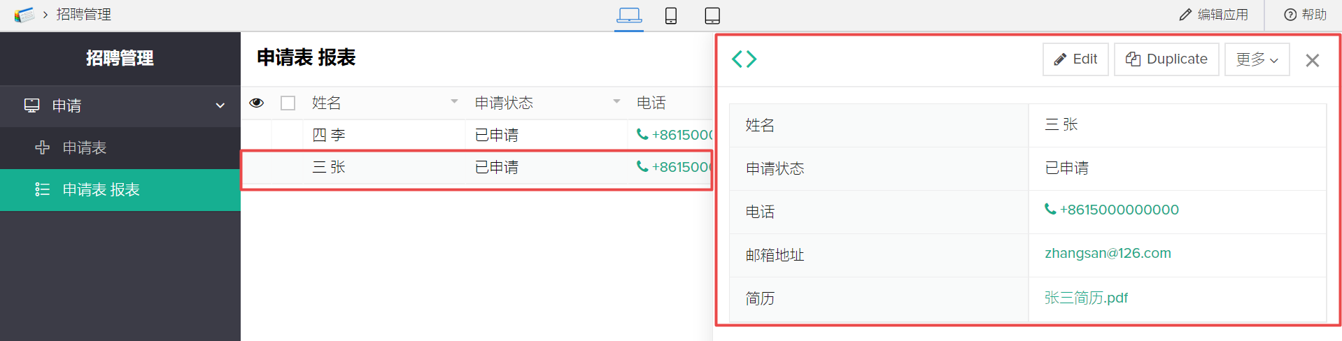当您点击一个记录时,详情视图将从右侧载入。报表的详情视图让您的用户可以详细地查看单条记录。