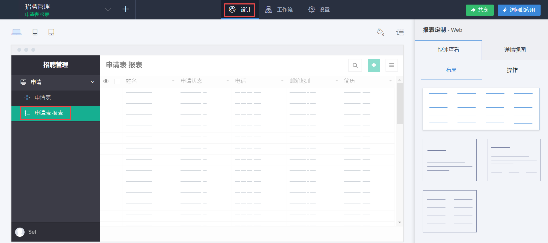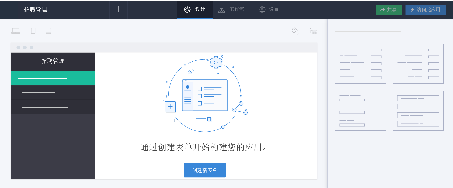 将应用的名称设置为“招聘管理”,然后点击创建。系统会将您带至应用的设计页面: