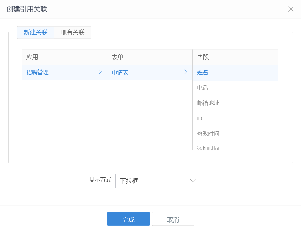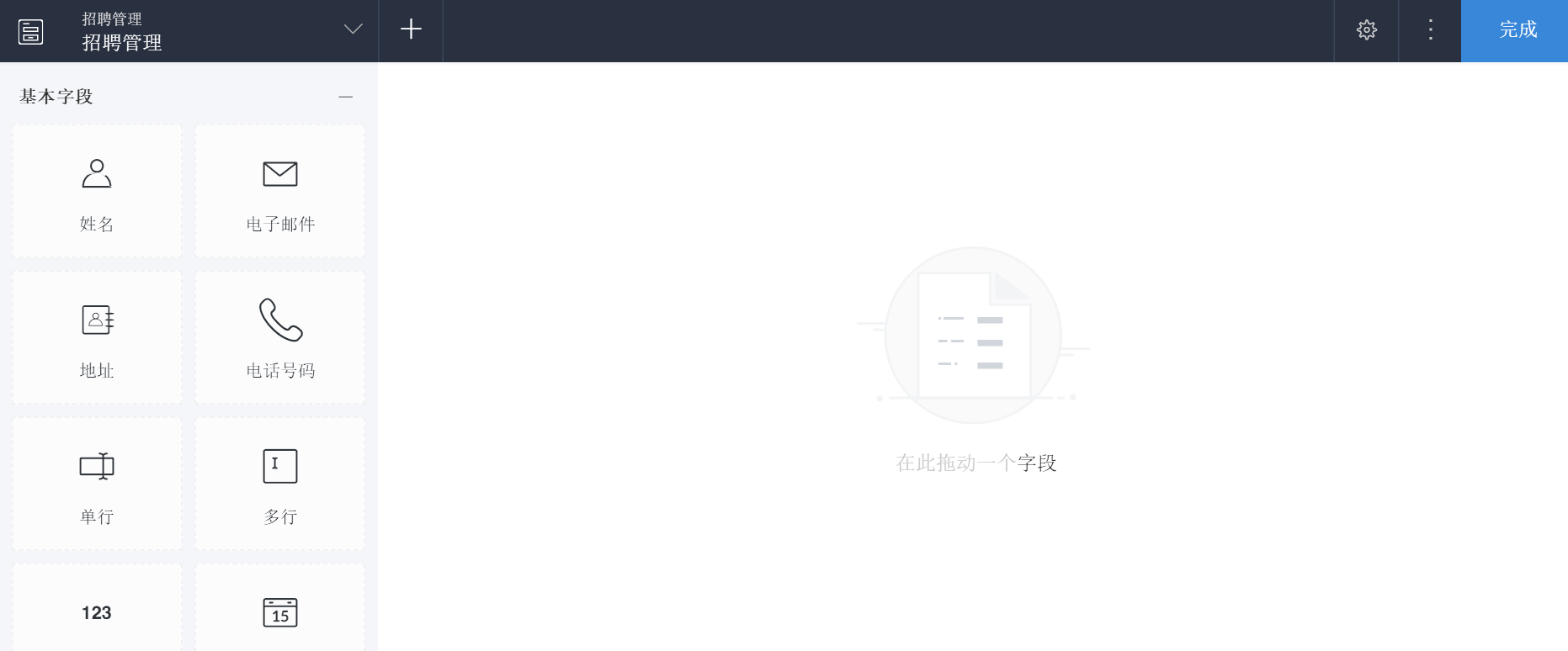 字段类型 将其字段名称设置为 配置其字段属性 邮件 邮箱地址 设置为必填 电话 电话 - 文件上传 简历 设置为必填 点击显示在表单构建器右上角的完成: