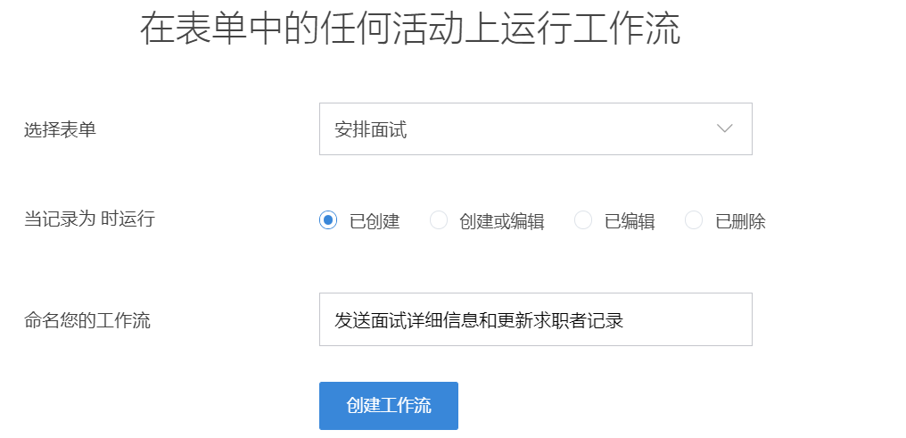 | 当经理安排其面试时自动通知求职者 | 创建工作流,在经理安排面试时发送邮件 |