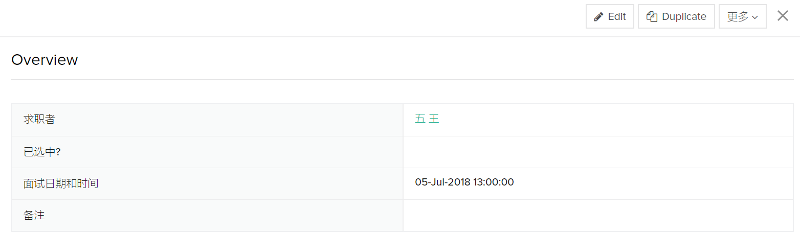 - 点击编辑按钮。此时“安排面试”表单将会打开,其中包含所选记录的详细信息。