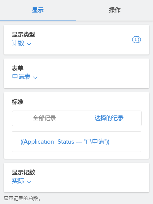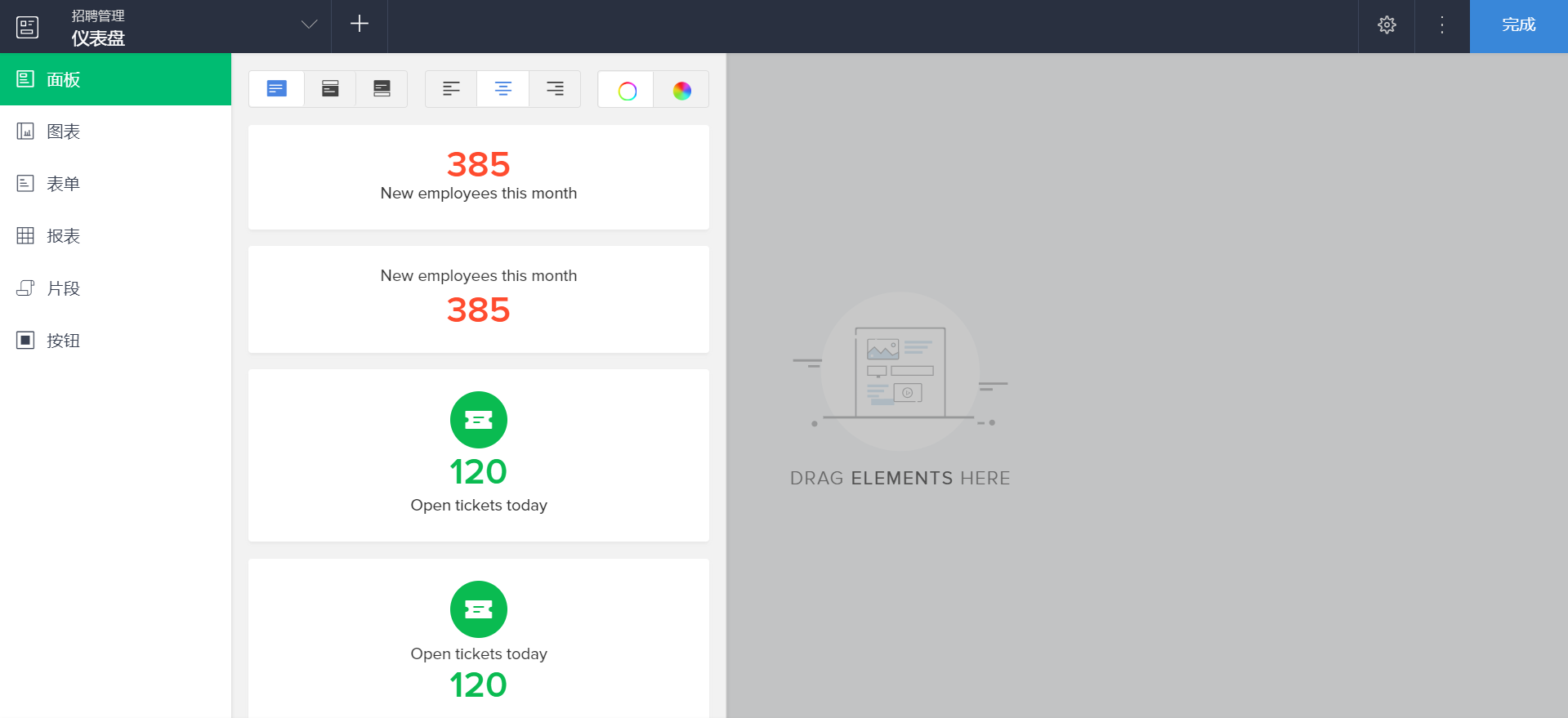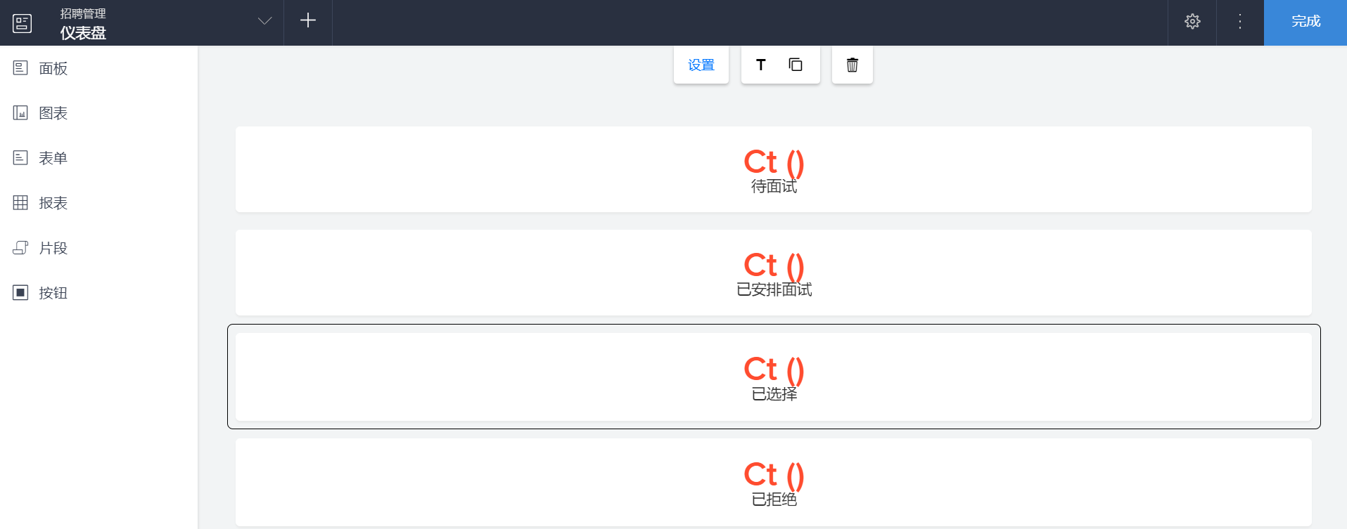 点击左侧的面板,然后重复步骤 4 至 11,让您的页面中有总共 4 个面板显示申请表中的记录的计数,记录的申请状态为“已申请”、“已安排面试”、“已选中”和“已拒绝”。