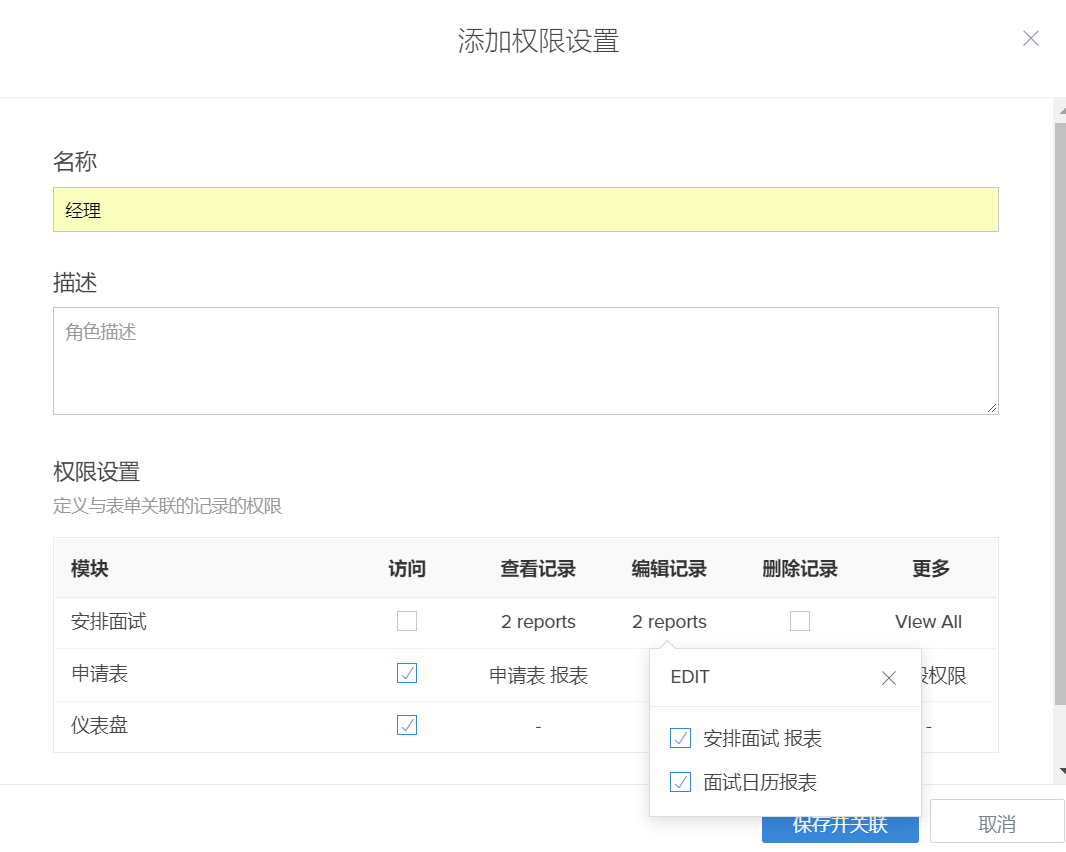 - 点击申请表旁边的查看复选框,然后选择所有申请报表。(经理不能在该表单中添加条目;他们应能够查看所有已提交的条目;他们不能编辑任何条目)
