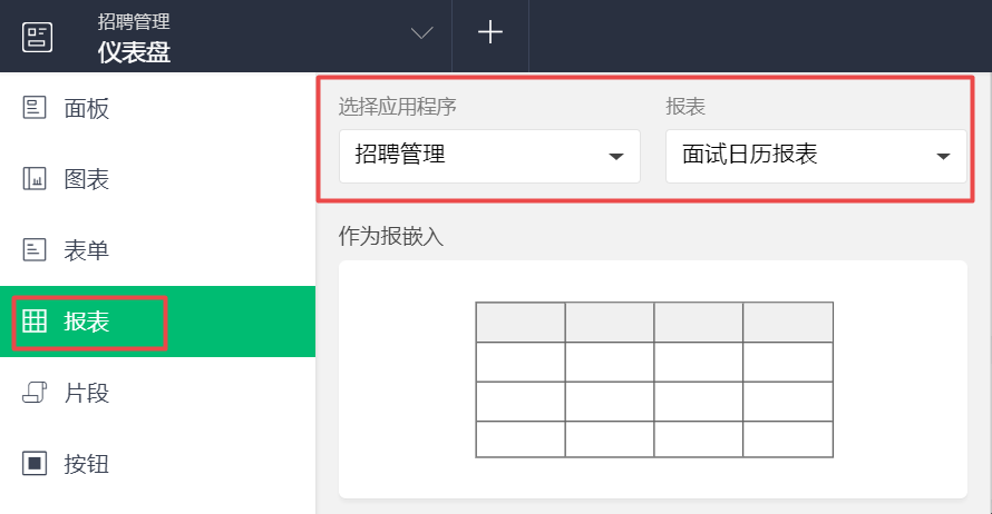 选择左侧显示的报表,选择招聘管理应用程序,然后选择面试看板报表: