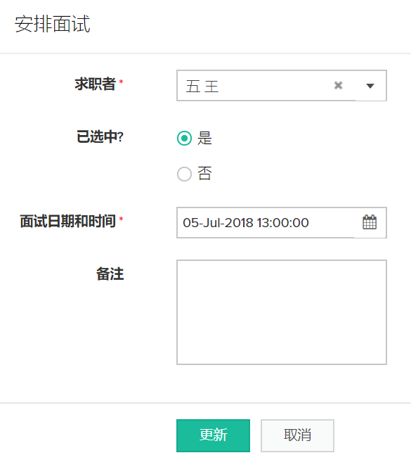将已选中?字段设置为是以选择该求职者,或设置为否以否决该求职者,然后点击更新。根据作出的选择,该求职者的申请状态会更新为“已选中”或“已拒绝”。