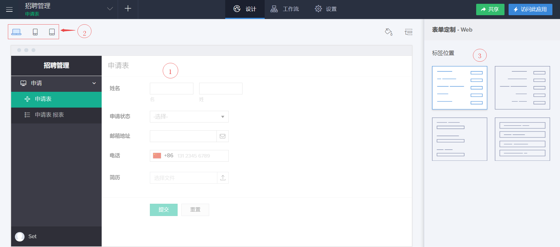 点击手机图标,如下所示。此时将显示申请表的设计页面,包含在手机上访问时其外观的预览: