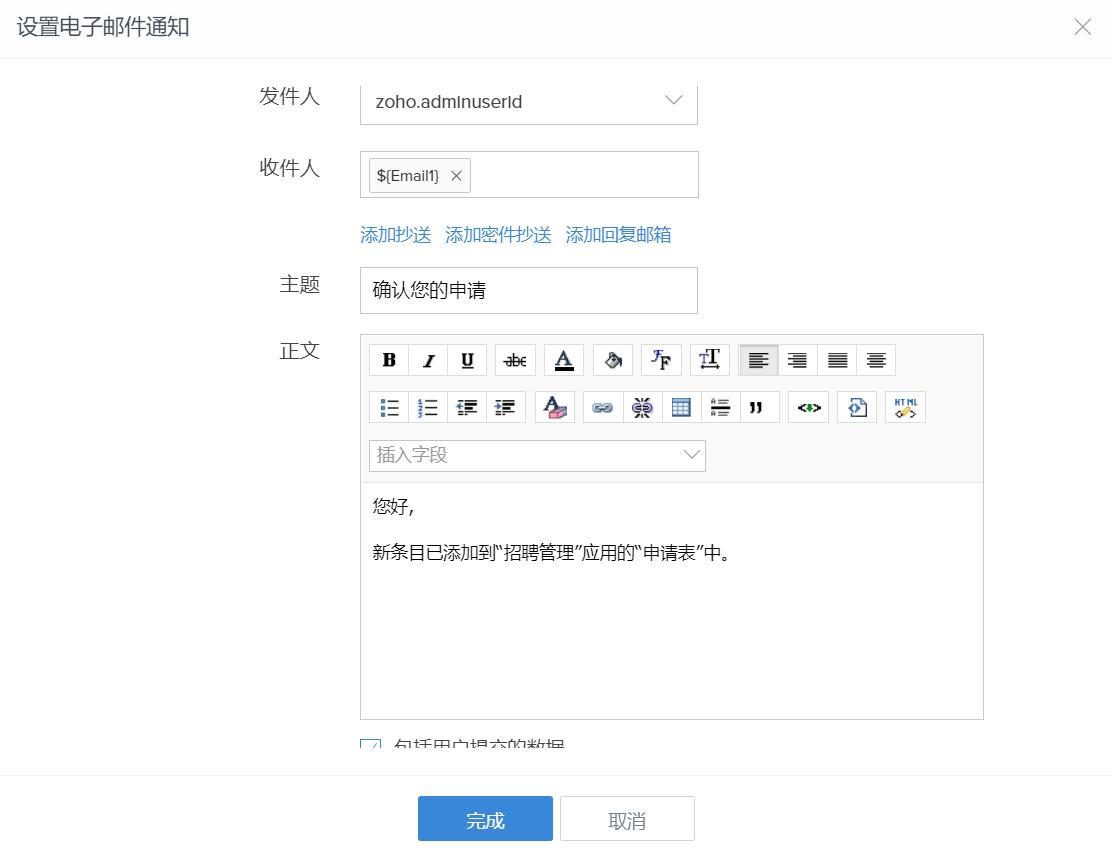 因为求职者在提交申请表时会提供其邮箱地址,我们可以通过此邮箱地址在他们提交表单时发送邮件来通知他们。您可以使用 Zoho Creator 的其中一个表单内置功能来达到这个目的。启用在表单提交时发送邮件: