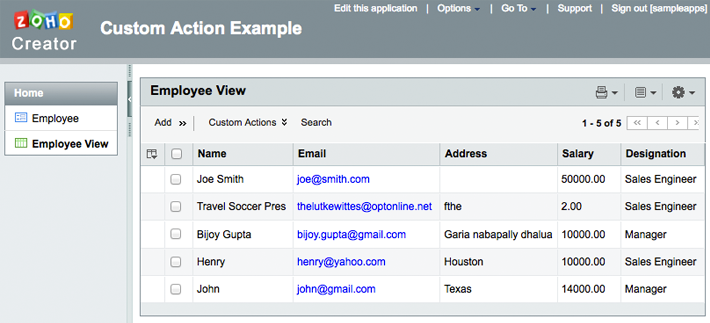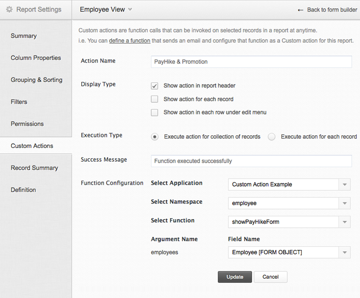 为“Employee View”配置名为“PayHike & Promotion”的自定义动作,以便计算此视图中所选记录的加薪。自定义动作调用名为“showPayHikeForm”的函数,它将 Employee 表单作为表单对象参数传递给函数。