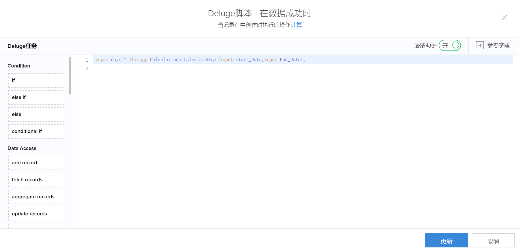3.当在表单中提交记录时,调用添加时 -> 成功时脚本,它将执行 CalculateDays 函数并使用函数返回的值更新 Number_of_days 字段。