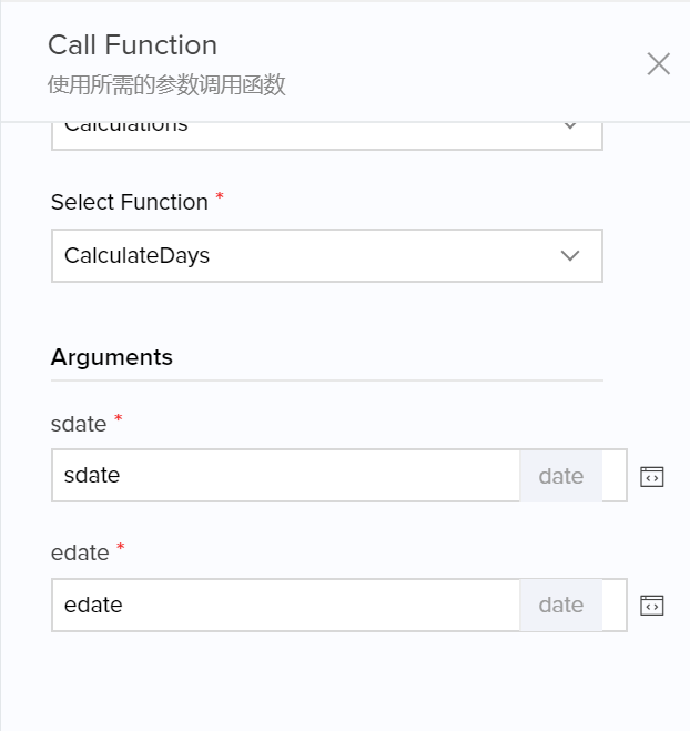- 在显示的对话框中,指定函数名称、命名空间和参数值。例如,让我们通过指定参数值 sdate 和 edate 来调用 CalculateDays。