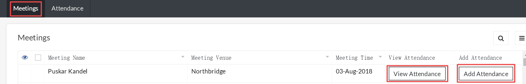 每次会议的出席详情可通过选择 view attendance(查看出席者)按钮来查看,如下所示