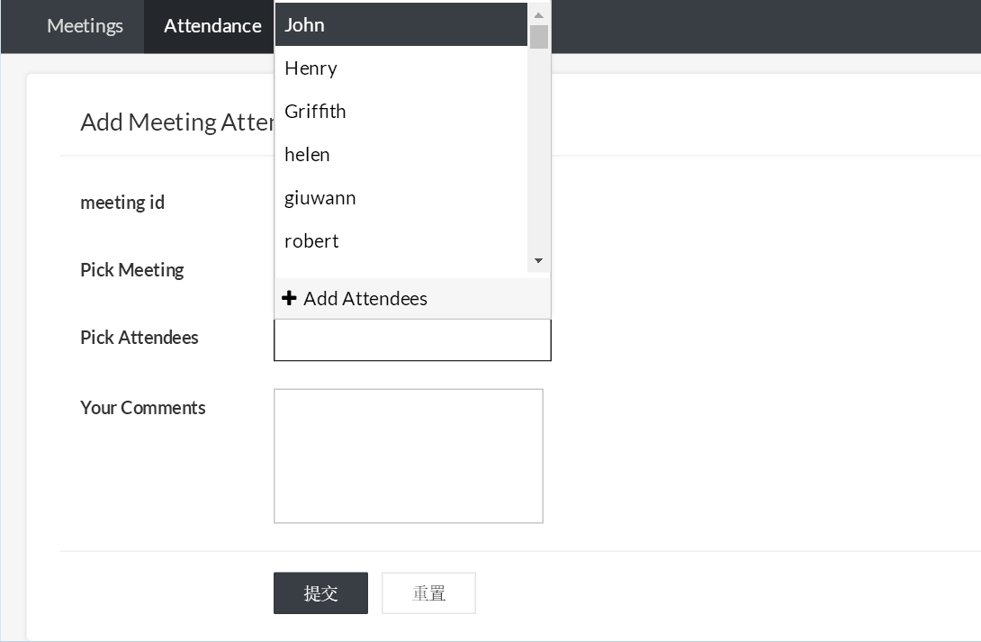 2.Add Meeting Attendance(添加会议出席者) - 用于为每次会议输入出席者的表单。通过选择如下所示的按钮从会议视图调用此表单