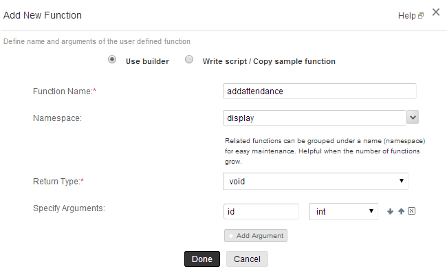 2. 在函数对话框中,指定函数名称、命名空间、返回类型以及要传递给此函数的参数。在此示例中,我们定义了一个名为“addattendance”的函数,它将为视图中的所选记录显示“Add Attendance”表单。因此,返回类型指定为无效,且记录 ID 作为参数传递给函数。