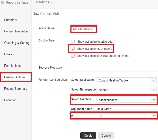 现在让我们了解自定义按钮“Add Attendance(添加出席者)”和“View Attendance(查看出席者)”如何添加到会议视图。“Add Attendance(添加出席者)”和“View Attendance(查看出席者)”称为自定义动作按钮。“自定义动作”是集成在 ZC 报表中的一个功能,让用户能够对报表中的所选记录调用特定的用户定义函数。