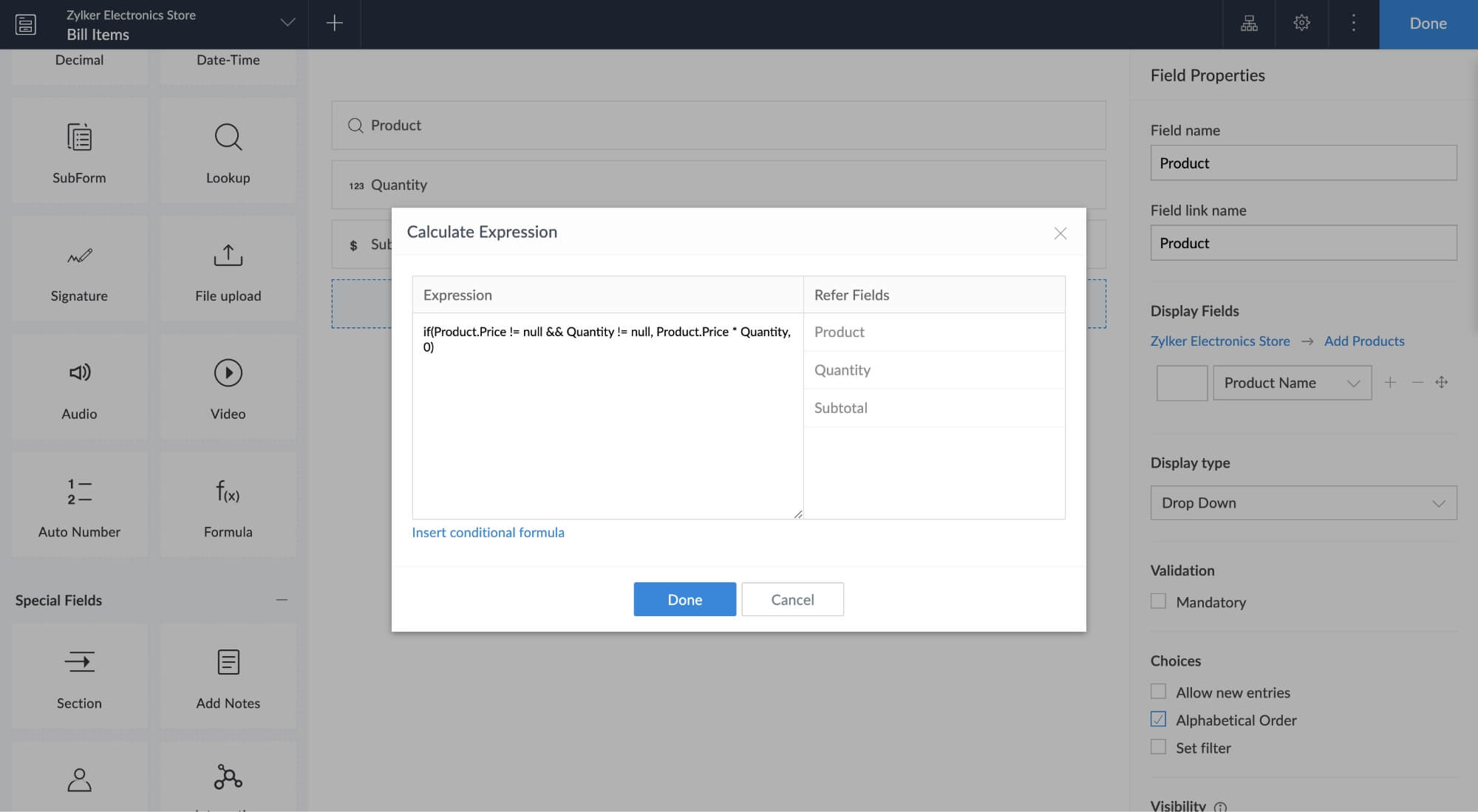 一位客户可能购买 6 件商品,而另一位客户可能只购买 3 件商品。使用 Zoho Creator 的子表单满足每个人的需求。您可以使用子表单在主表单和一系列子表单之间创建一对多关系。