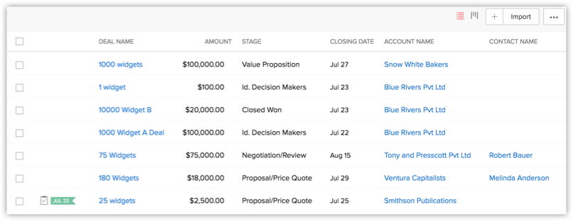 Zoho CRM的商机模块提供了两种类型的视图——【列表视图】和【阶段视图】。列表视图按照您排列的顺序逐一显示所有商机,而阶段视图则根据商机阶段对商机进行分类。