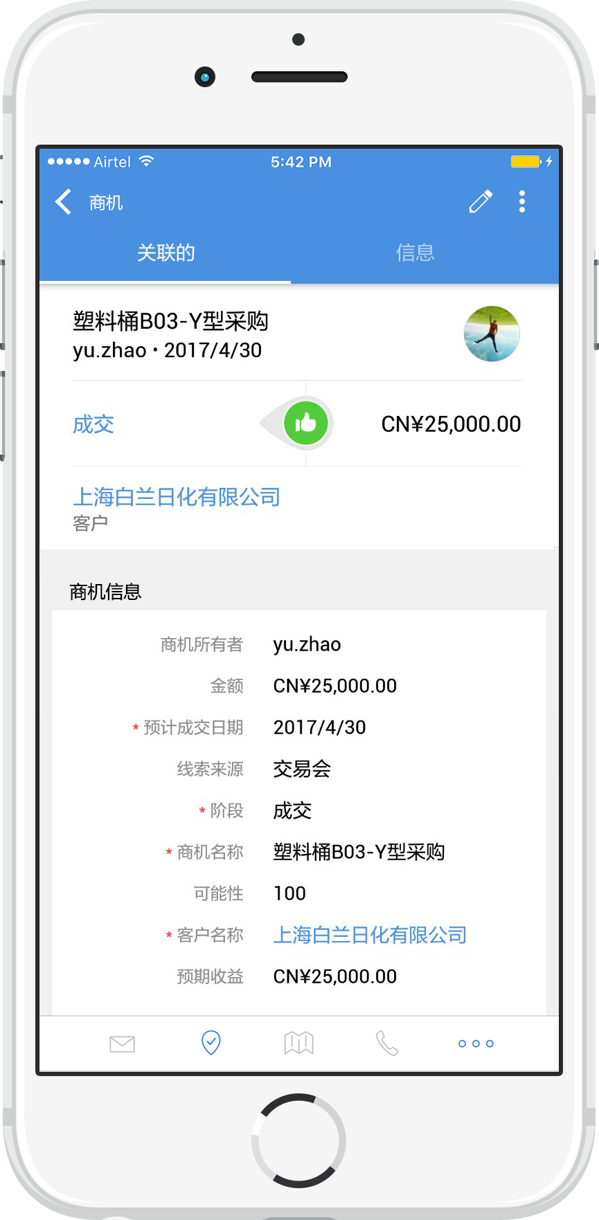 使用CRM的手机app上的签到功能可记录与客户的会议。 您还可以通知同事与客户的联系状态,以便同事采取后续操作。