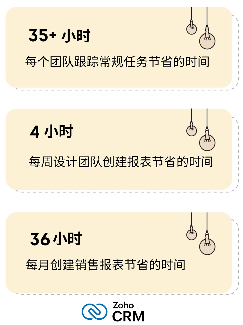 Zoho CRM被应用于销售团队、设计团队和客户关系管理团队。