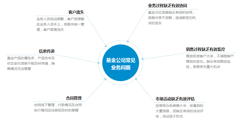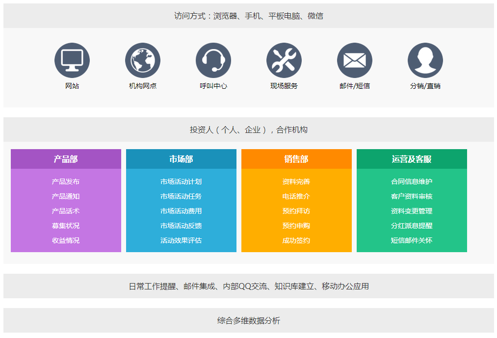 Zoho CRM基金行业解决方案框架包括客户信息整合、智能业务流程化、合规管控、数据分析决策、精准营销与全流程服务管理六大模块。通过高度自动化和个性化定制,帮助基金公司构建以客户为中心的数字化运营体系,提升业务协同、风险防控与客户满意度。
