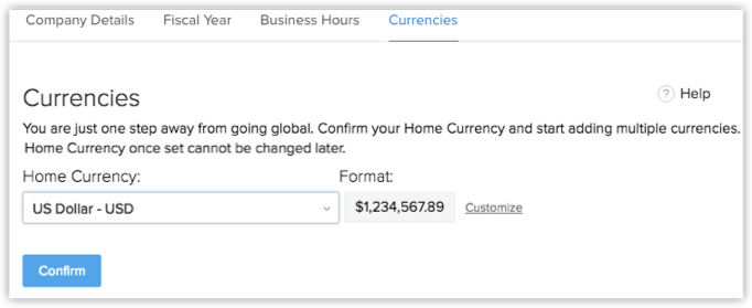 设置货币是机构特定功能。 默认情况下,货币设置为美元 ($)。 但是,有管理员权限的用户可以根据机构要求更改货币设置。 根据您选择的国家区域,货币可针对报价单、发货单、市场活动和其它账单相关字段进行更新。