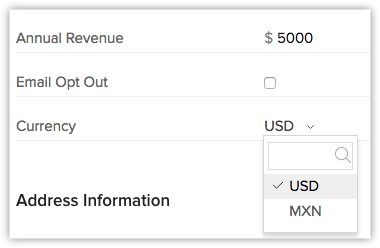 Zoho CRM 中的记录将有货币字段,在该字段中您可以选择您的机构的 CRM 账户中可用的货币。 此字段仅在多种货币功能启用后可用。 记录中的所有账户字段将以记录货币表示数值,之后则是括号中的以基础货币表示的金额。