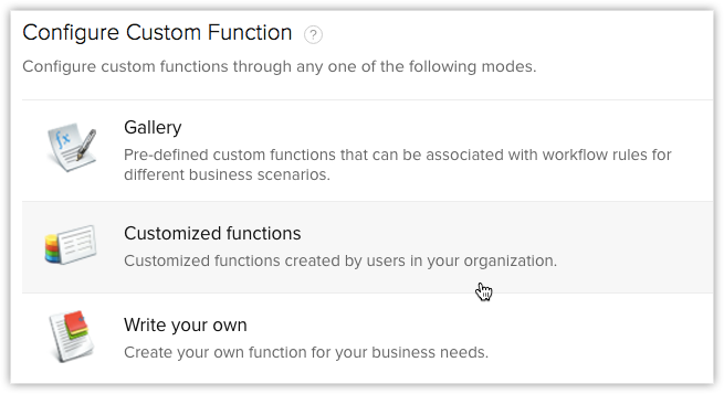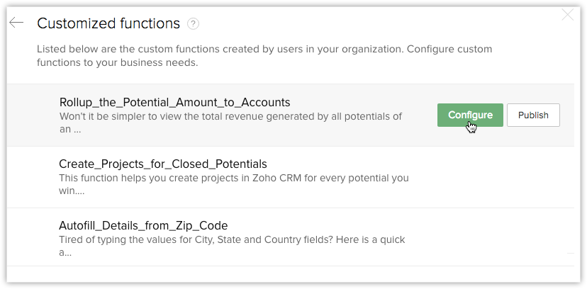 您的编程人员编程的所有自定义函数都在自定义函数页面列出。 编程人员通过这种方式可以集中精力处理部署 Deluge Scripts,在这样的情况下 CRM 管理员可以在关联工作流规则的同时部署彻底测试自定义函数。