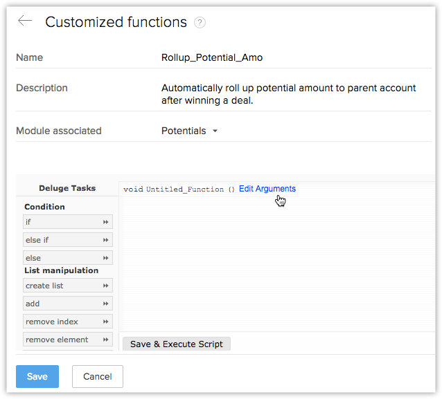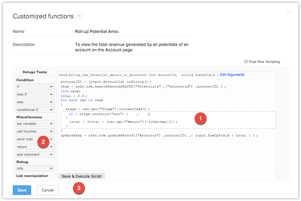 - 在 Deluge Script Editor 中编写您需要的函数。 点击保存&执行脚本,验证您的代码。
