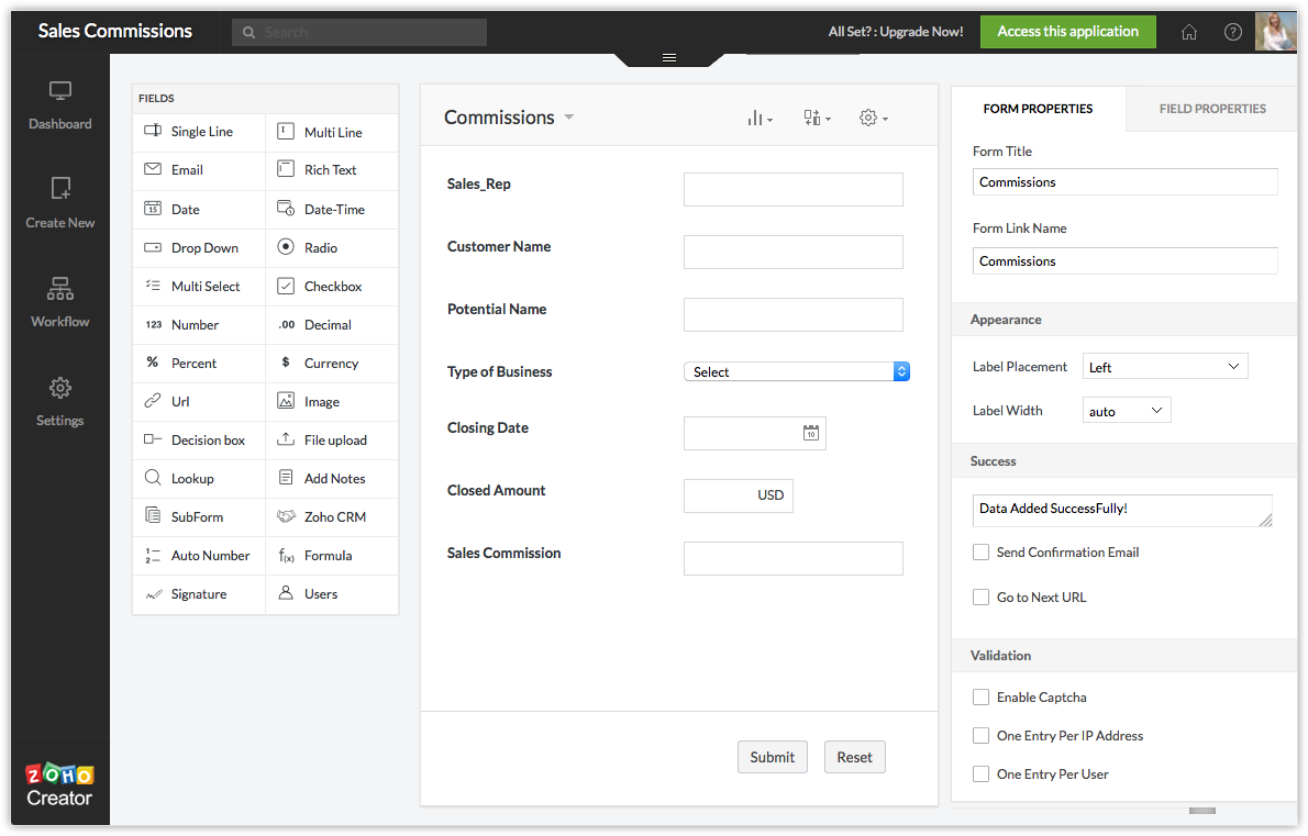 - 在Zoho Creator里创建销售佣金应用(请参阅Zoho Creator教程创建应用)