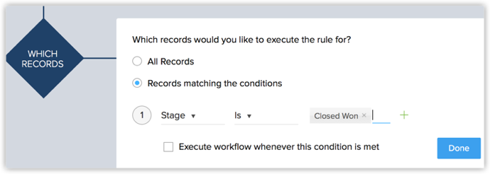 - 设置规则标准: 标准应该是“潜在客户阶段为已结束并赢得客户”。 确保您未选择在满足这一条件的任何时候执行工作流。 如果此选框未被选中,这意味着工作流仅在第一次达到条件时被执行,这一案例就是这种情况。