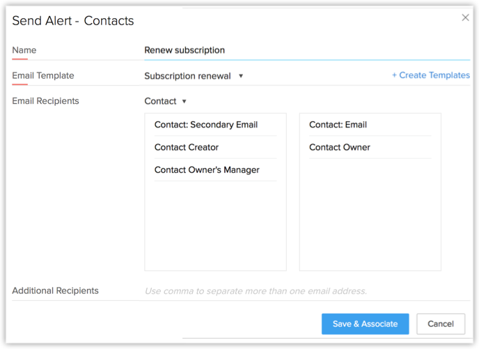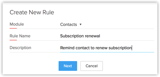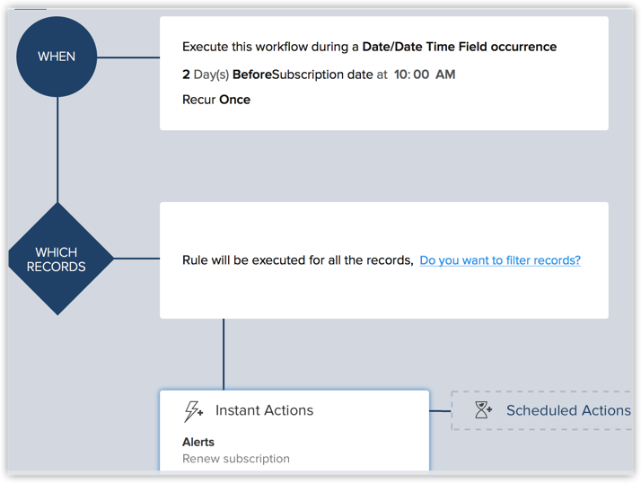 假设您希望发送自动化的邮件提醒给您的客户,要求他们在到期日两天前更新他们的订阅。 我们来看看,在 Zoho CRM 中您可以如何轻松完成这一操作。