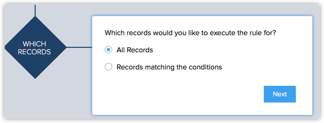 - 设置规则标准: 如果您认为规则应该仅适用于一套特定的记录,请相应地提及规则标准。 否则请选择所有记录。 如果是这种情况,则规则将适用于联系人模块中的所有记录。