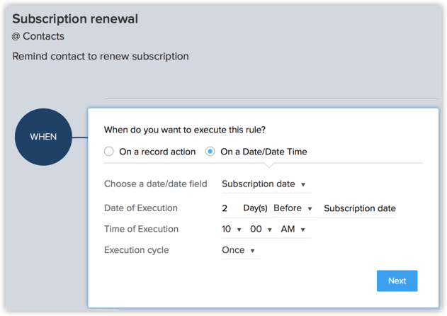- 指定规则触发器: 选择日期/日期时间。 选择规则触发应作为依据的日期字段,在这种情况下为订阅日期。 根据需要指定执行日期(在这种情况下到期日 2 天前)、时间和周期。