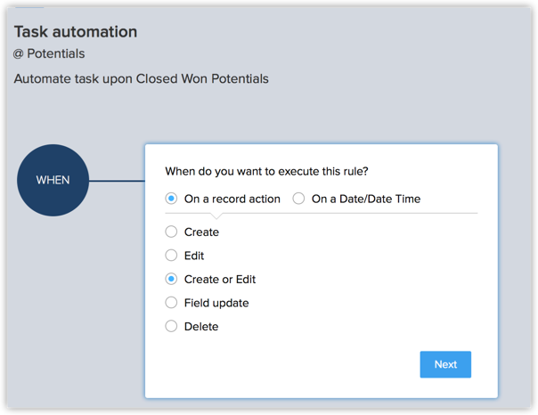 - 指定规则触发器。 选择记录操作。 理想情况下,应该将创建或编辑指定为规则触发器,因为您想要在新潜在客户被创建(已结束并赢得客户作为潜在客户阶段或现有潜在客户的阶段被更新为已结束并赢得客户)的任何时候执行规则。