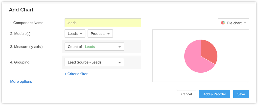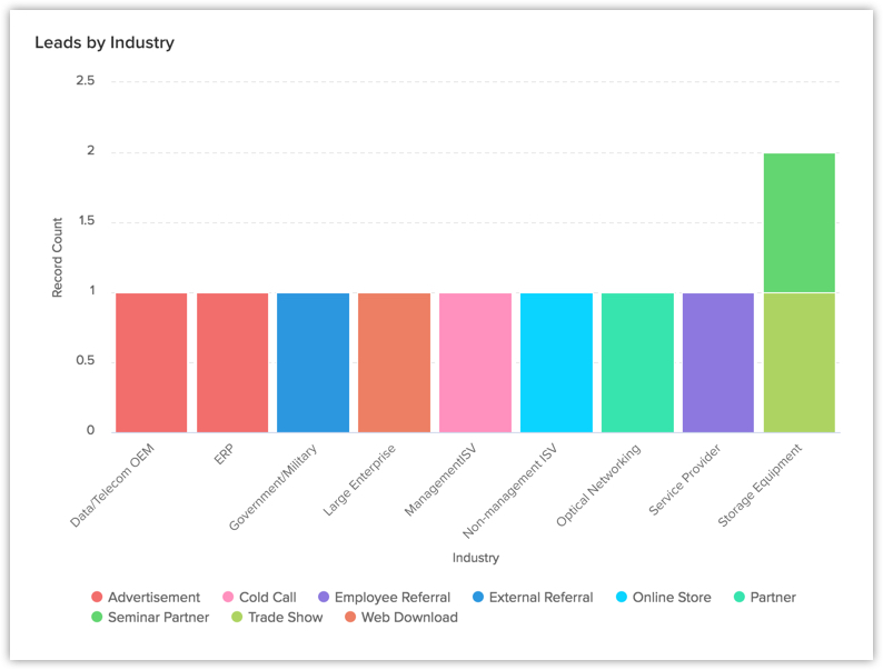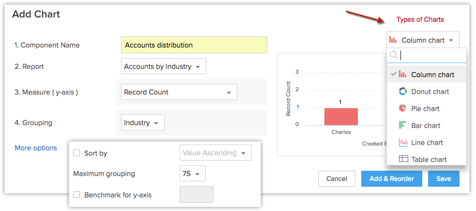 图表以一种可视或图形表示法来显示来自模块中不同记录中的数据,以便轻松分析。数据看一眼就可以理解,因为用户可以轻松地选出模式、趋势等,否则,这些会难以理解。例如,您是亚太地区的一名销售经理,想要比较上一年由销售代表创建的线索数。您可以通过在您的仪表板中创建图表来完成,然后比较不同销售代表创建的线索数。