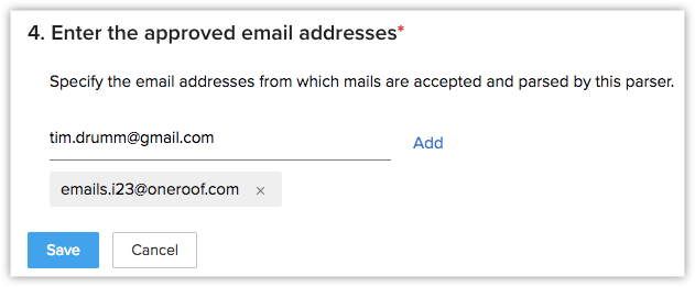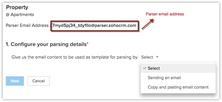 您配置解析器后,Zoho CRM 会自动生成解析器电子邮件地址。您要解析的所有邮件必须发送至该解析器电子邮件地址。
