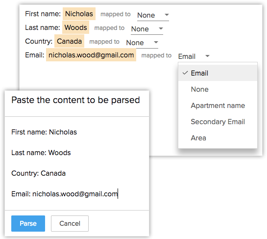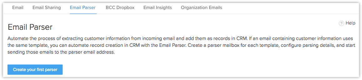 电子邮件解析器旨在通过抽取接收邮件中的信息来自动完成向 Zoho CRM 添加记录的过程。电子邮件解析器可抽取线索的明细并直接添加至 CRM 记录。