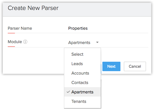 在创建您的第一个电子邮件解析器页面中,输入解析器名称,然后从下拉列表中选择模块。 - 点击下一步以继续。